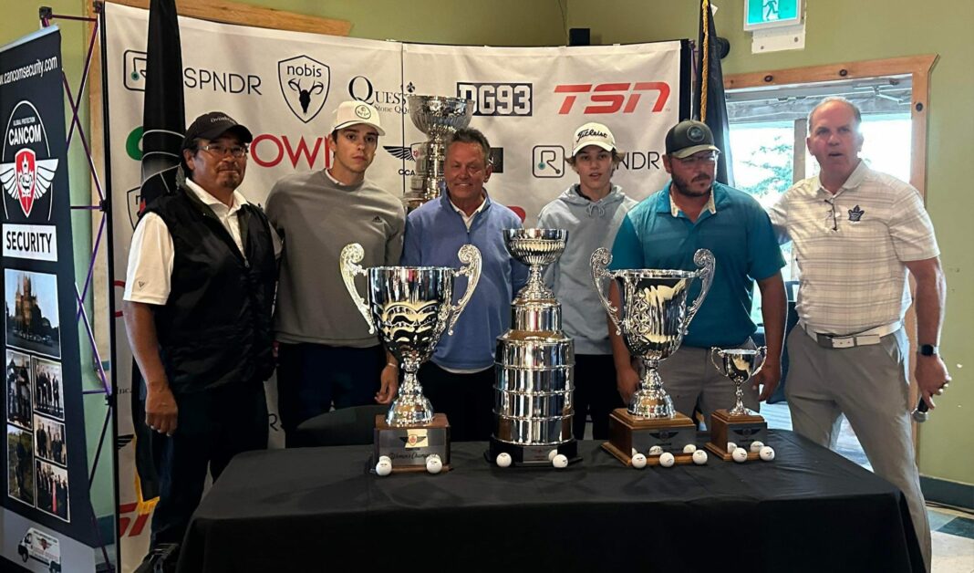 Cup champs! The annual Cancom Cup tournament was held at the Rainbow Ridge Golf Course in Manitowaning recently. 100 players participated in the tournament including special guest former National Hockey League star Doug Gilmour, who brought former NHL player Ric Nattress to participate as well. Ronald Wells, CEO of Cancom Security Inc. which hosted the tournament said $6,500 was raised through the tournament, with these funds going toward Wiikwemkoong Minor Hockey Association. The Pierre Trudeau team won the Cancom Cup. In photo left is Pierre Trudeau, Carter Abotossaway, Doug Gilmour, Noah Thorpe, Chris Assiniwe and Ric Nattress.