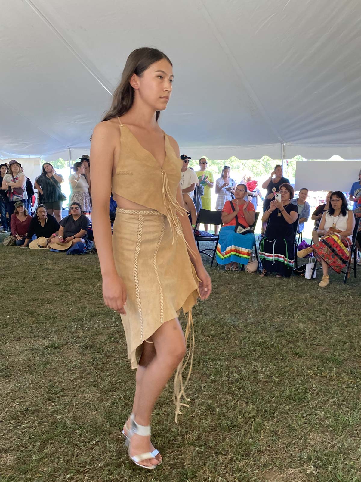 The Wiikwemkoong Fashion Show was a major hit with over six designers exhibiting. The model featured above is wearing a Bruno Henry creation. photo by Bonnie Kogos