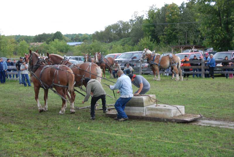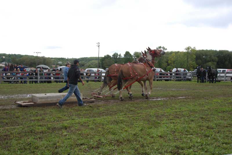 In the lightweight division, Cliff George and his team of Dolly and Bill pulled 8,500 pounds while John Graham and Snap and Bell came in second place with their pull of 8,500 pounds at one foot eight inches. Doug Thompson placed third with 8,000 pounds over 15 feet courtesy of Josh and Doc. Justine Rydall, the only female competitor, pulled 8,000 pounds 14 feet with Peanut and Buck.