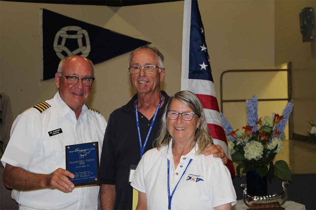 Awards followed the dinner and the first went to Karen Riley and Bernie Coyne, winners of the Pico sailboat races. The second award was for the cornhole competition, and it was presented to Norman Powell and Joe Riley. There were plaques awarded to those who travelled the farthest by water: Norman and Jody Powell were third place winners, travelling a distance of 498 nautical miles from Holland, Michigan; second place went to Maria Redson and Ken Hurst for travelling 532 nautical miles from Michigan City, Indiana; and first place in the longest distance travelled by water went to Lynn Squire and Bernie Coyne, 731 nautical miles from Portland, Maine.