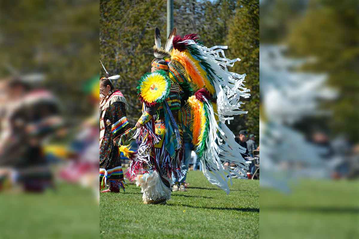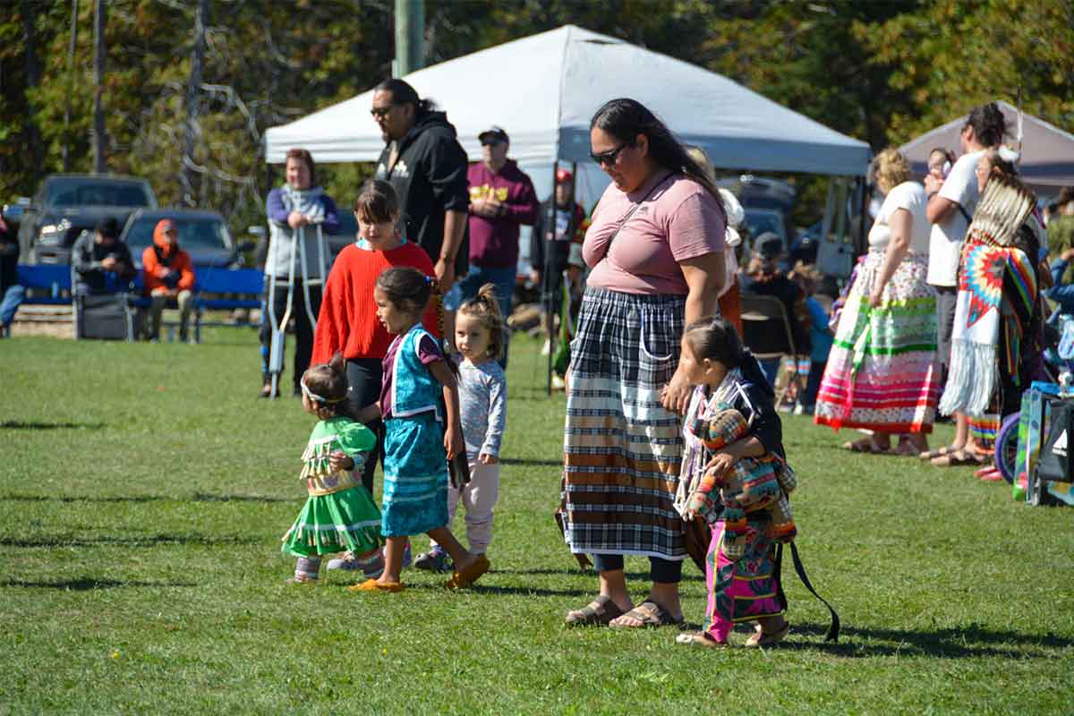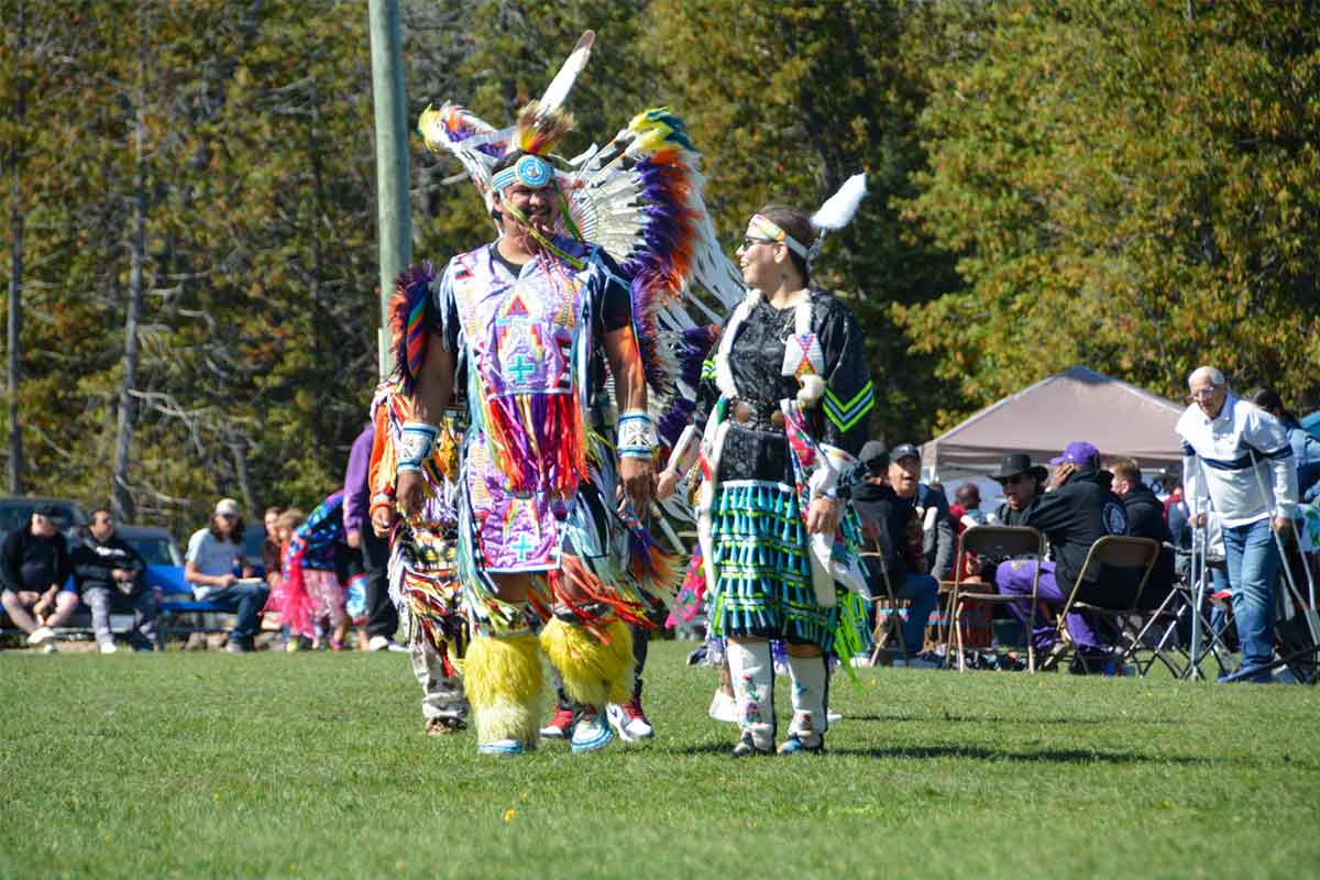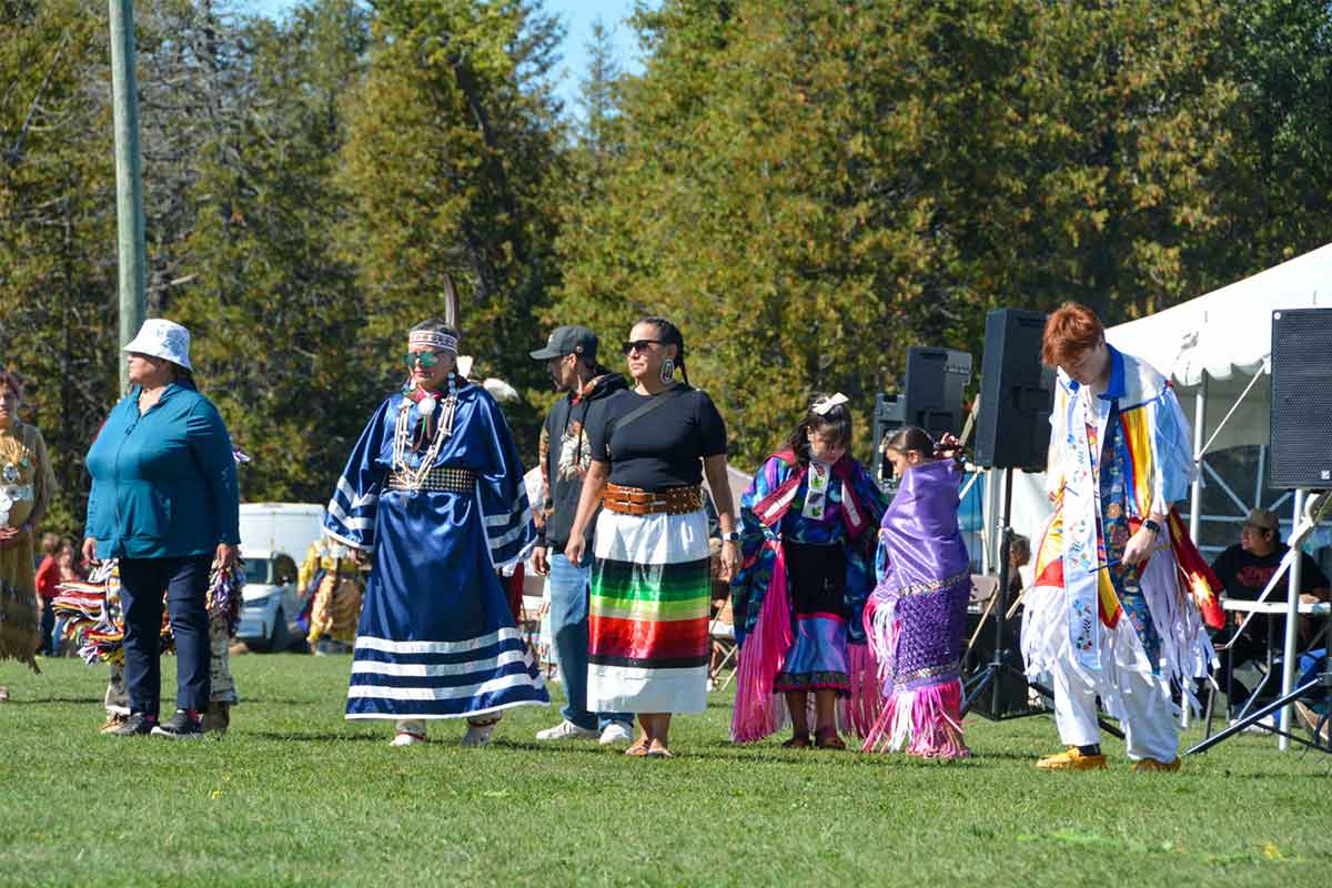 The Wawaskinaga Powwow princesses are, from left, Dakota Crowe, Haisley Jacko and Kendra Nebenionquit. Whitefish River First Nation Ogimaa Rodney Nahwegahbow, front, poses with the royalty.Head adult dancers Wesley Cleland and Chelsea Recollet share a laugh during an intertribal at the Wawaskinaga Powwow.Nice bustle! A men’s fancy dancer’s regalia flutters in the warm autumn breeze during the Wawskinaga Powwow.Cathy, Lisa and Andrea McGregor make their way around the arena during a Saturday intertribal.Camille Baibomcowai (bottom right, with teddy) had her first official dance at the Wawaskinaga Powwow on Saturday. To help mark the special occasion, Camille hosted a tiny tots girls’ special with prizes to be won. photos by Alicia McCutcheon