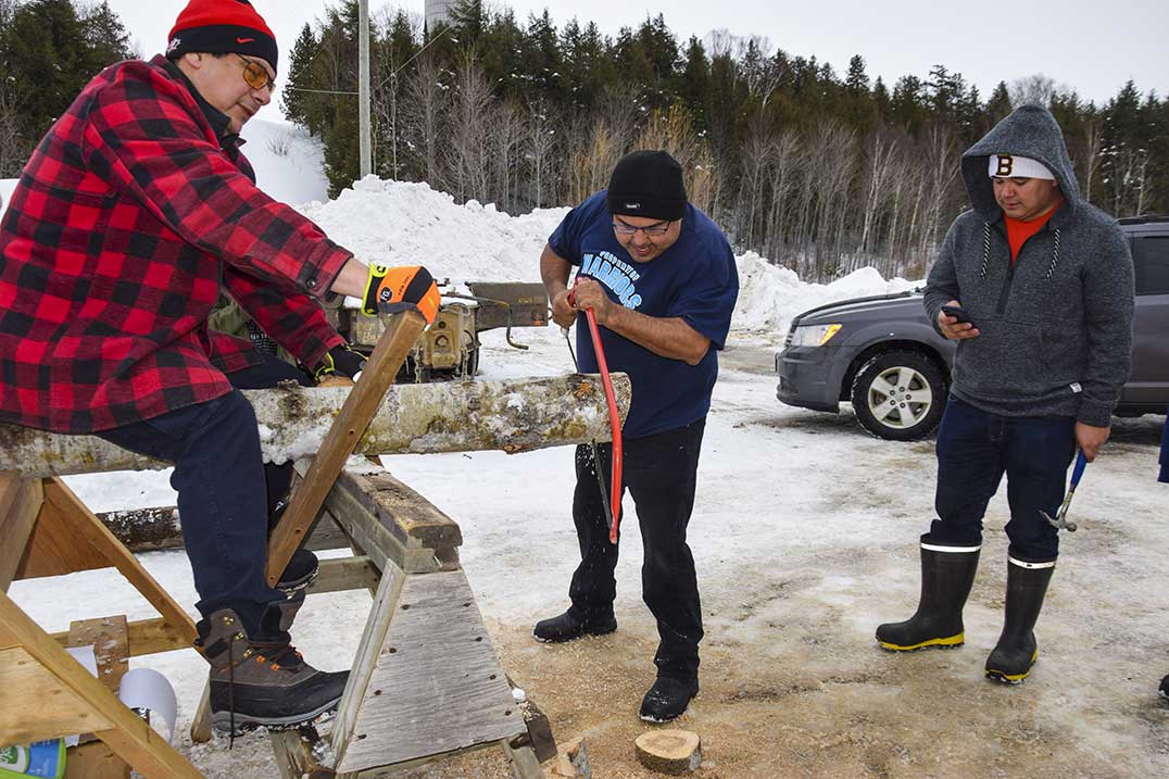 SEE-SAW—Steve McGregor, left, keeps the log steady as Jeff McGregor vies for the fastest time in the log sawing competition as part of the week-long Whitefish River First Nation Winter Carnival.