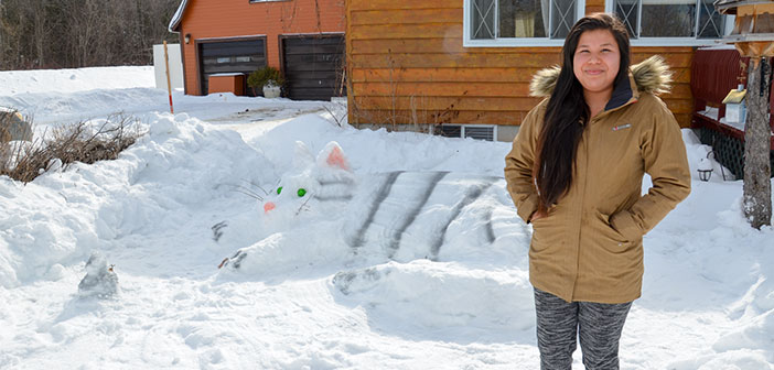 Wasi Lightning poses in front of her first place entry in the snow sculpture contest entitled Fiddle me Whiskers.