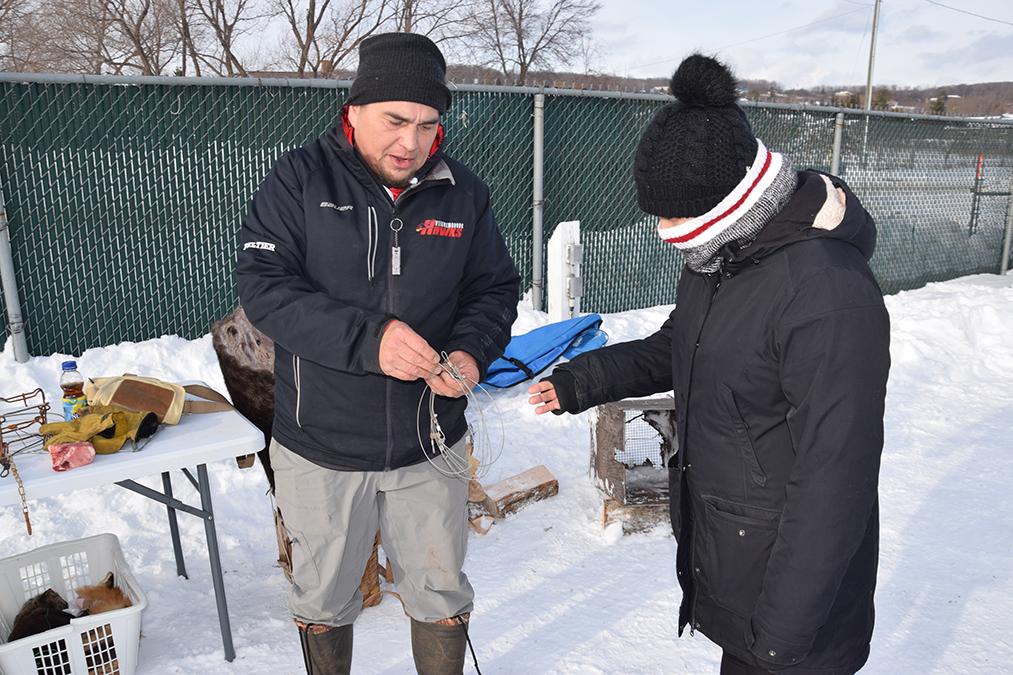 Home Wiiky culture days trapper Leroy Peltier demonstrates snare lines to a participant Wiiky culture days trapper Leroy Peltier demonstrates snare lines to a participant