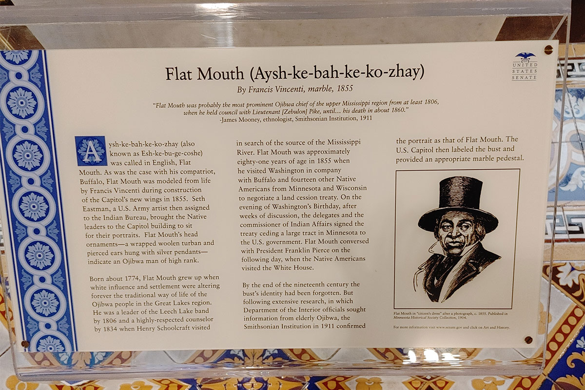 In any event, Esh-ke-bug-e-coshe, a chief of the Pillager band of Chippewa located in Minnesota, was invited back in the 1850s to come to Washington, DC as part of a delegation for the signing of a treaty that turned over a million acres of land to the US government. During his visit to the national capital, Esh-ke-bug-e-coshe sat for a portrait bust by the artist Francis Vincenti. That bust now stands on a pedestal outside the US Senate Chambers.