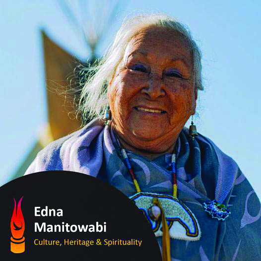 She is a fifth-degree member of the Midewiwin Society, the head woman and the Ogimaakwe (Head Leader Woman) of the Eastern Doorway Minweyweywigaan Lodge which spans across Ontario and Manitoba. Ms. Manitowabi co-founded this Lodge with the late Chief and Ogimaa Charles Nelson of the Western Doorway of the Lodge. Edna has helped Minweyweywigaan Lodge grow exponentially.