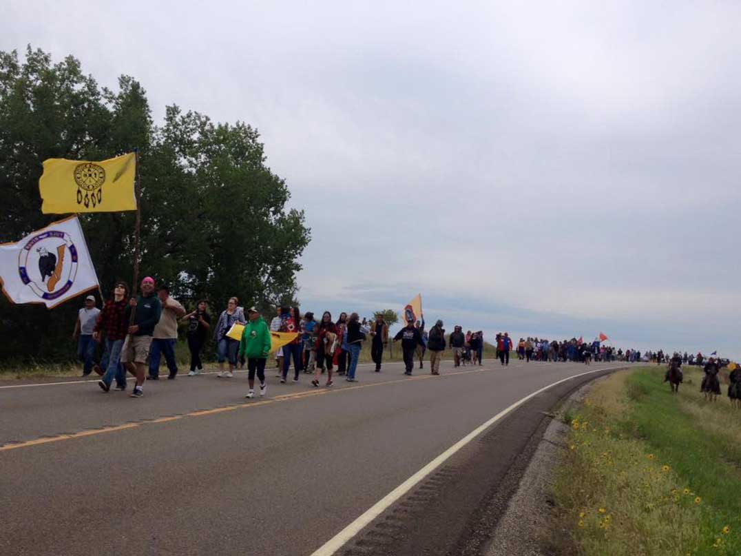 Wikwemikong flag can be seen as it joins those in a column of hundreds of supporters who had come in a show of solidarity against the pipeline.