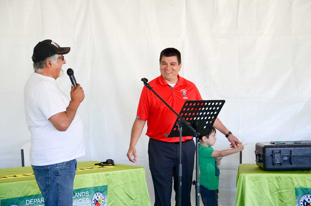 The first ceremony to take place on the Ki-nu maam-wi dun-kwesh-kwa-daad-wok be-maa-di-zi-jik (Bring the People Together) exchange was a sunrise ceremony. When the presentations and workshops began at 9 am, Roger Daybutch acted as emcee for the proceedings along with Stitch Manitowabi.