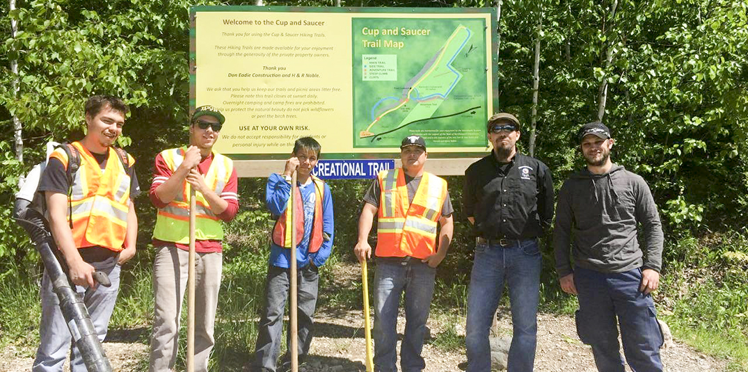 BIDWELL— A crack trail maintenance crew from Wikwemikong stepped up to assist the Manitoulin Tourism Association (MTA) to maintain and refurbish the Cup and Saucer Trail, helping to tidy up Mother Nature’s winter sojourn and improve safety and aesthetics along the trail.