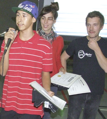 The screening, which took place in the gymnasium of Wasse Abin High School before an appreciative crowd that included the home town folks and a group of visiting world youth from Tanzania, began with three films from other communities. One chronicled the making of a traditional birch bark canoe, complete with the harvesting techniques of bark, cedar, roots and spruce gum. Another, by Wikwemikong’s own Amanda Roy (at the Wapikoni studios in Montreal), told the story of the quest to build a sweat lodge in the heart of Montreal Island and the final, Wapikoni Speaks Out, reported a presentation by Wapikoni Mobile youth to the United Nations Permanent Forum on Indigenous Issues.