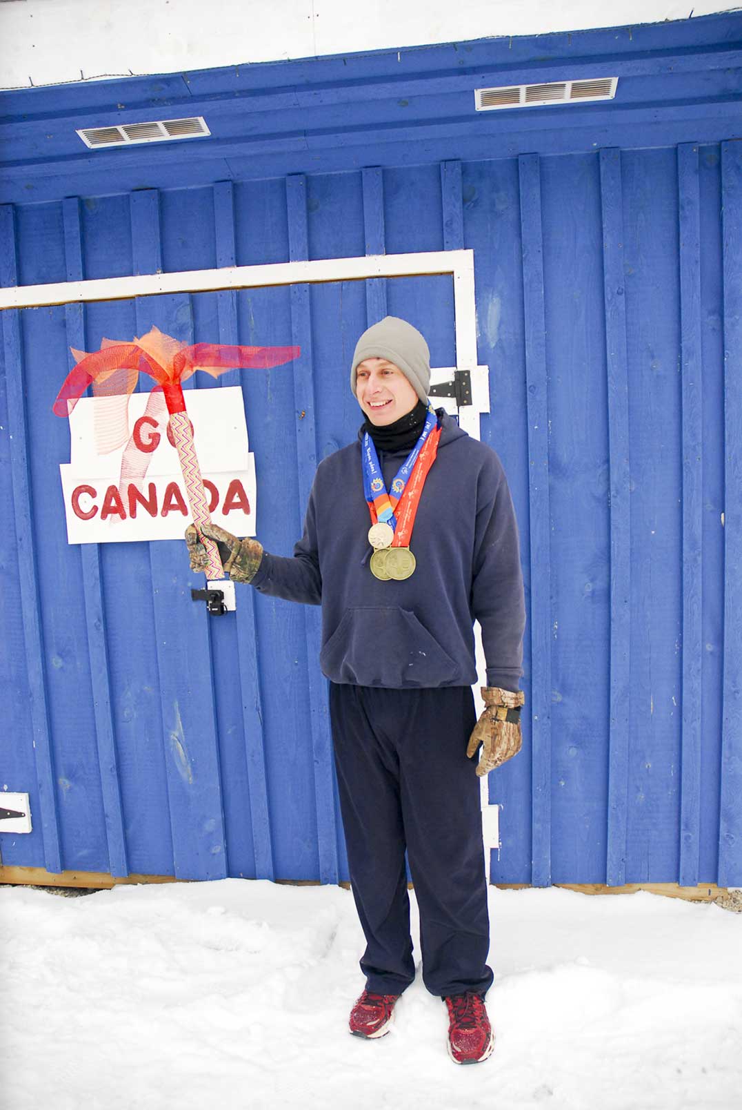 Manitoulin Special Olympic championship athlete Austin Featherstone donned his medals and kicked off the event with a torch run. He was rewarded with a cookie medal, homemade by Billings councillor Barbara Erskine who is also a member of the Billings Recreation Committee that organized the event.