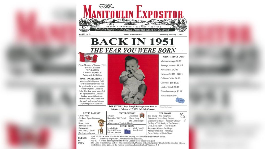 In 2021, Mr. Belanger’s sister Jo-Anne Mott celebrated the occasion of her brother Buck’s 70th birthday by creating a mock-up edition featuring the aforementioned baby picture on the front along with the notable events, fashions, television programs, popular songs and stars born in 1951, the year of his birth.
