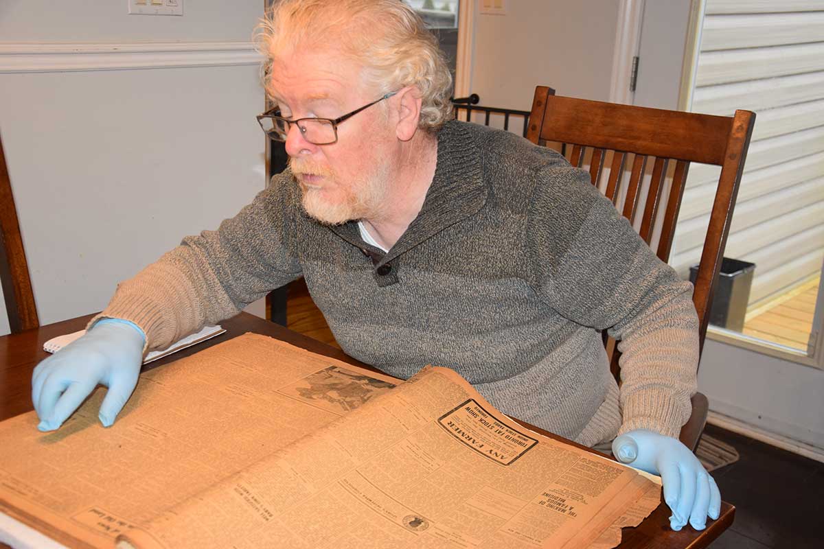 Hard copies of The Expositor are safely entrusted in the custody of the Assiginack Museum in Manitowaning, but that source is also currently unavailable to the public. Thankfully, Assiginack Museum curator Kelsey Maguire agreed to release the desired 1920 volume along with extreme cautionary admonitions—with good reason. Over the course of the intervening 100 years, the ancient paper has grown delicate and brittle requiring both a gentle touch and gloved hands (to prevent oils from further damaging the fragile pages).