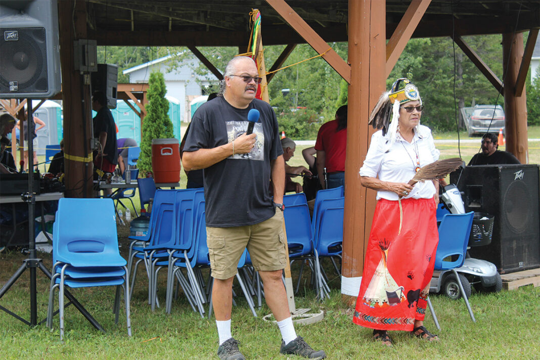Zhiibaahaasing First Nation Councillor Kevin Mossip and Chief Irene Kells spoke at the opening of the community’s 28th annual powwow held this past weekend. photos by Tom Sasvari